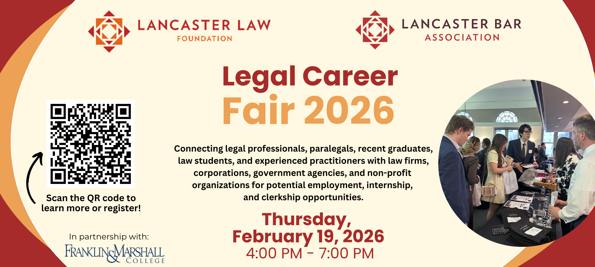 Join us for theĀ 2026 Legal Career Fair, hosted by the Lancaster Bar Association and the Lancaster Law Foundation! This exciting event connects students, recent graduates, and job seekers with professionals, firms, and organizations across the legal field. Whether you are exploring career options, recruiting talent, or supporting the future of the profession, the Legal Career Fair offers valuable opportunities for everyone.